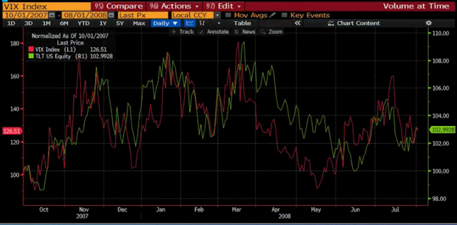 So, when was another time we saw this occur? Bond price up, stocks up, VIX up? Uh oh, the end of 2007. Yes, throughout the one year time frame from August 2007 to August 2008, bond prices moved lock step in correlation to VIX.